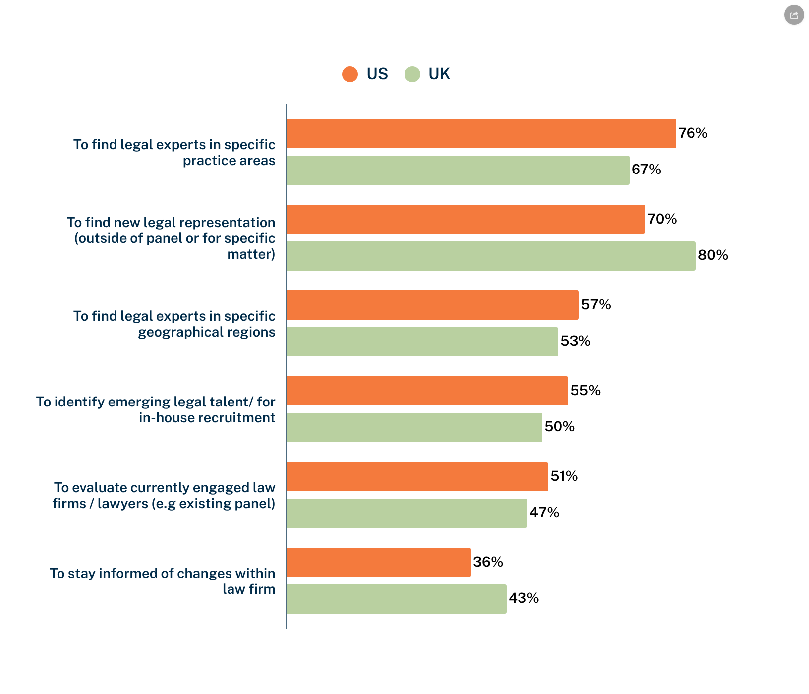 US IHC use rankings primarily to identify expertise. The most common use — to find experts in practice areas (76%) — reflects a need for precision and confidence when navigating complex or unfamiliar legal terrain. Finding new legal representation (70%) comes close behind, suggesting that rankings are a key input when refreshing panels or sourcing specialist support.